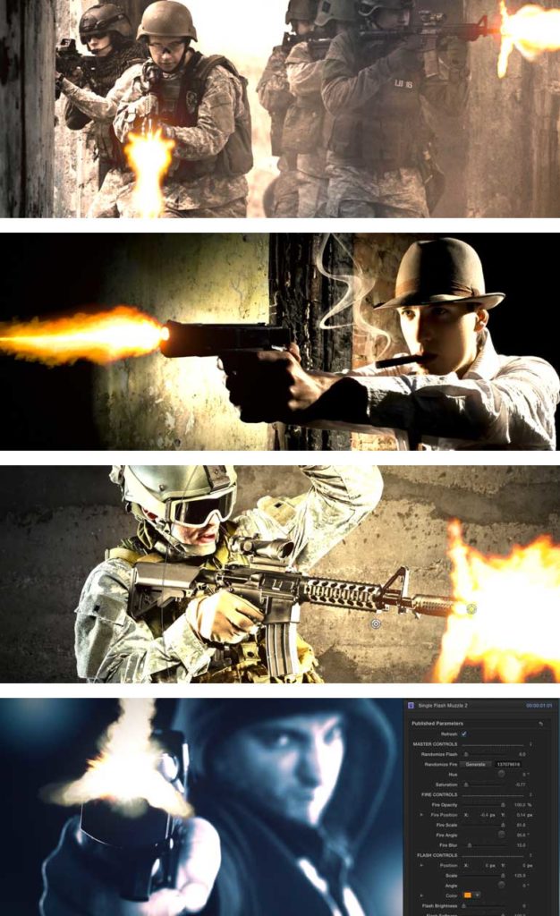 Progun offre più di 30 preset personalizzabili per dare alla tua prossima azione un bagliore aggiuntivo. Seleziona uno o più muso di fuoco, ognuno con il suo stile individuale. Personalizza tonalità, saturazione, opacità, sfocatura, quantità di fuoco e altro ancora. Ogni categoria offre parametri pubblicati divertenti e facili da usare per tutti i Final Cut Pro X. su