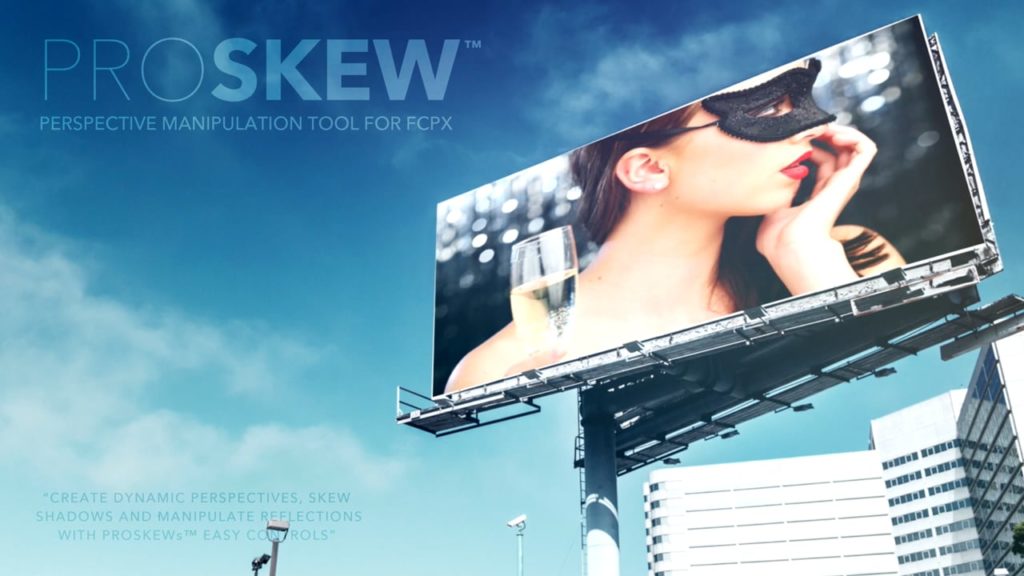 PROSKEW è uno strumento per Final Cut Pro X che consente agli utenti di creare l’illusione di una prospettiva distorta all’interno di una scena. Utilizzare PROSKEW per assegnare immagini e video a schermi TV, tablet, computer, pubblicità e cartelloni pubblicitari. PROSKEW utilizzo senza sforzo in Final Cut Pro X con l’aiuto di controlli su schermo e controlli di composizione intelligente. PROSKEW richiede l’ultima versione di Final Cut Pro X.